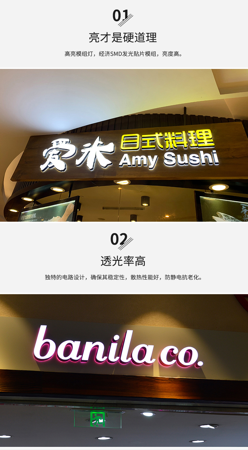 迷你發光字一般單從字面上理解為“迷你”字,第一印象就是精致小巧,迷你發光字一般又被稱之為迷你亞克力發光字,主要指的就是亞克力板材經過雕刻,粘貼打磨,裝高亮led光源,然后經過油漆表面處理完成的一種發光字,和水晶亞克力發光字有著根本區別。整個制作過程為機械化制作,所以迷你發光字可以制作成較小,很精致的字形,從環保角度來說,亞克力發光字老舊的字殼可以按照國家標準進行回收利用,在國外頗受歡迎。