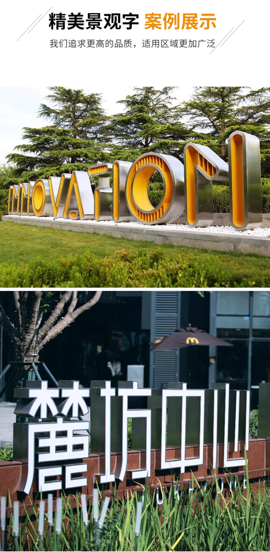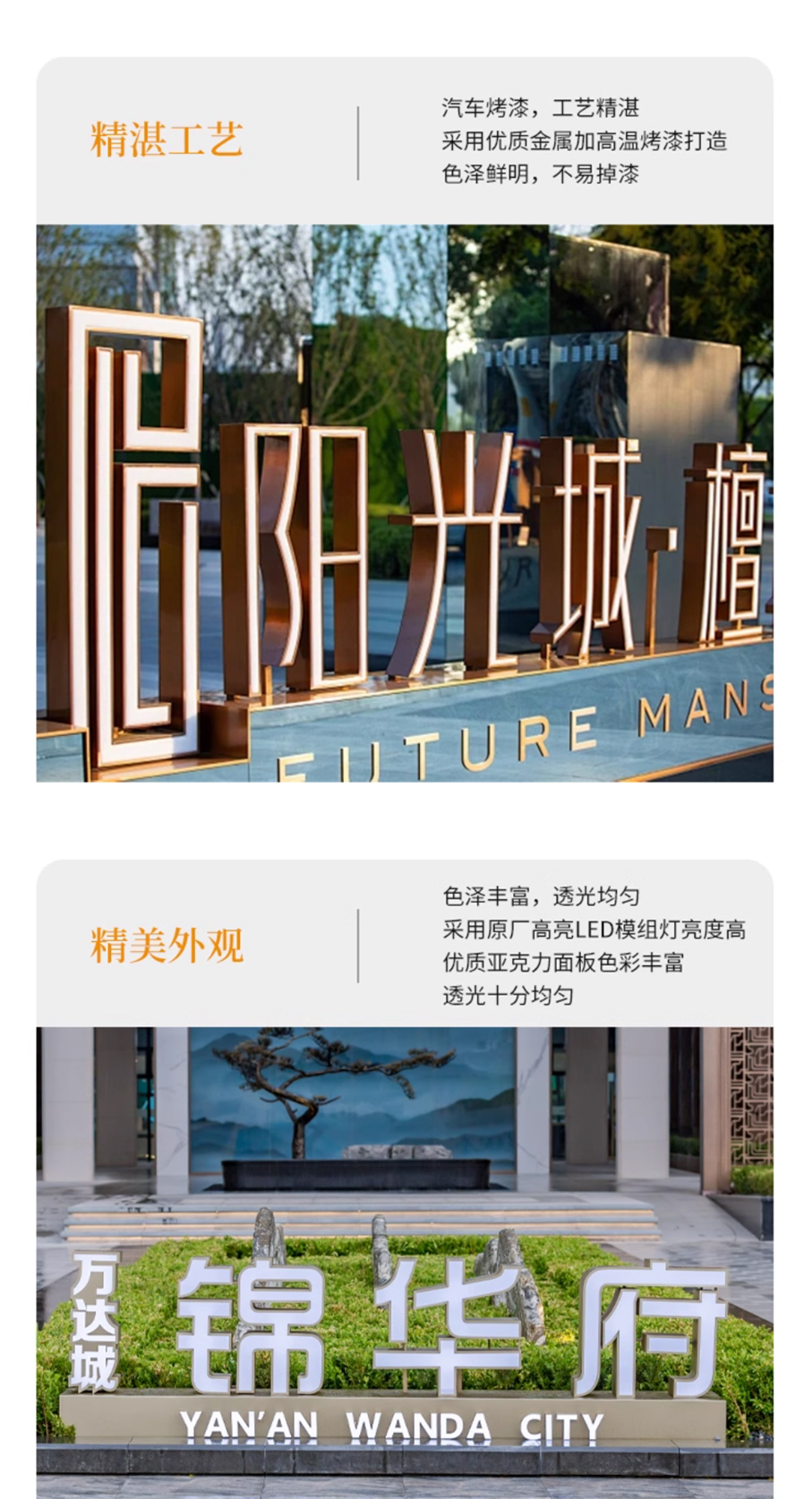 2. 材質多元,定制靈活:覆蓋金屬(不銹鋼、鋁合金)、亞克力、樹脂等多種材質,可根據(jù)您的品牌調性、使用環(huán)境(室內/戶外)及預算,定制尺寸、顏色與發(fā)光效果(如需),滿足個性化需求。